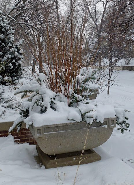 The photo shows one of our concrete containers with vertical willow and fir branches after a Thanksgiving snow a few years ago - nice!